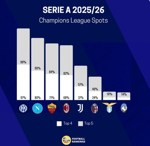 直播吧11月11日讯意甲11轮比赛之后,国米、罗马同分位居前二,米兰和那不勒斯同样同分以两分之差位居三四位。Footballrankings对意甲球队闯进前五概率进行了预测,国米以99%位居榜首。