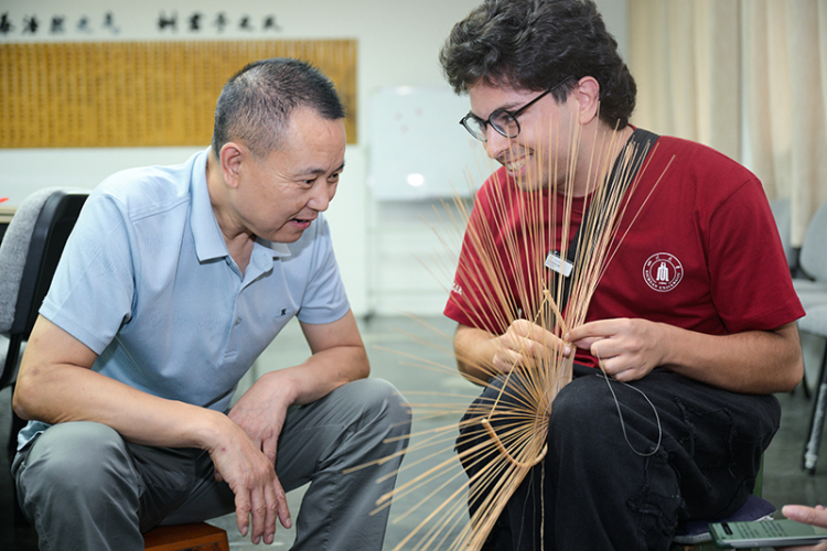 来自西班牙的胡睿阳在非遗传承人杨占勇的指导下,尝试制作潮扇。亲身体验后,他感慨道:“我之前以为它们只是普通的扇子,现在才发现它们融合了巴蜀文化的特点。原来‘福禄’二字拿在手上,象征着把福气握在手中。”
