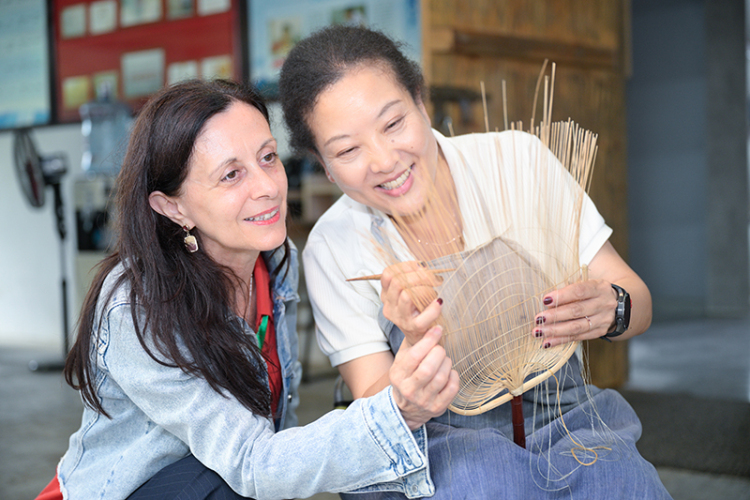 在高槐村,国际主播网红首先探访德阳潮扇制作工坊。德阳潮扇以其精湛的竹编技艺和独特的文化寓意吸引众人的目光。德阳潮扇以其“以竹为骨,以绢为面,以文为墨,以画为魂”的独特风格,成为连接过去与未来的文化桥梁,并于2007年入选四川省非物质文化遗产名录。