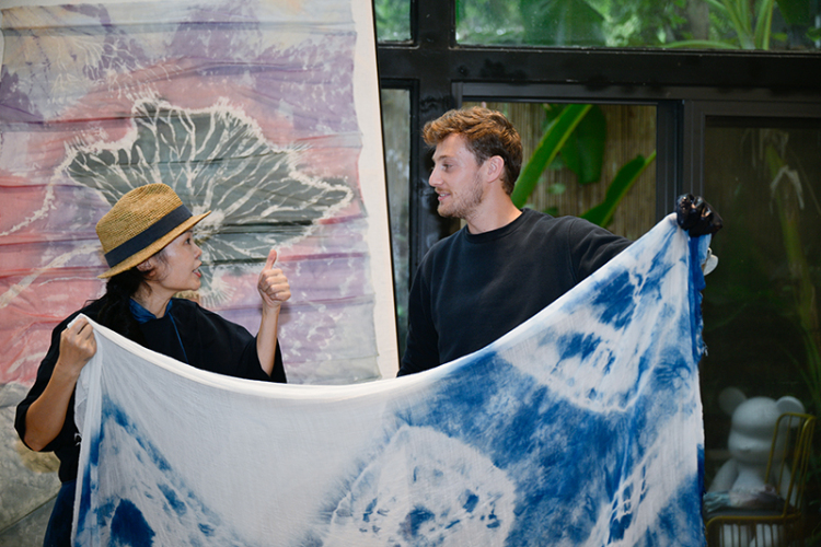 贝勒福(右)展示自己参与制作的染画作品 摄影 廖志全