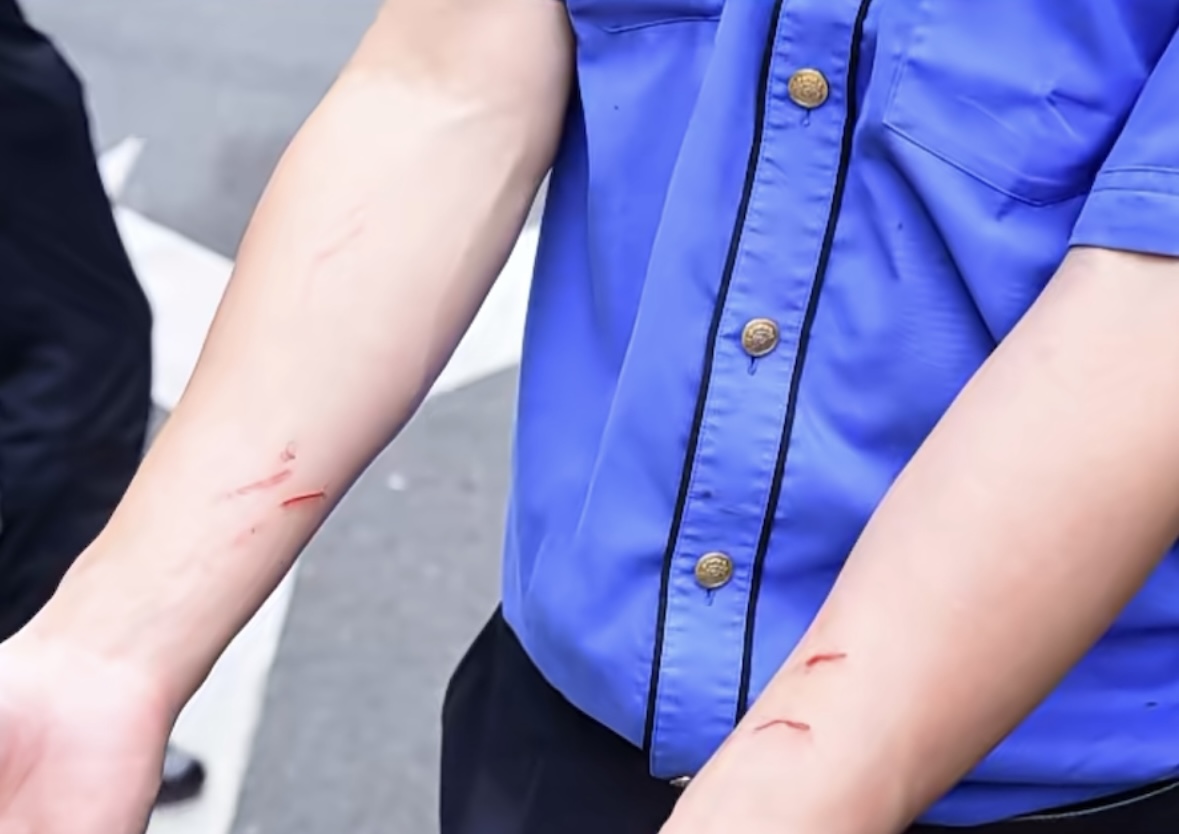 综合执法局称店主动手抓伤了执法人员的手臂。图据乐山市市中区融媒体中心